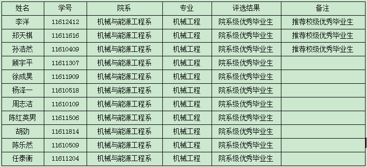 南方科技大学机械与能源工程系院系级优秀毕业生获奖名单和校级优秀毕业生推荐名单公示